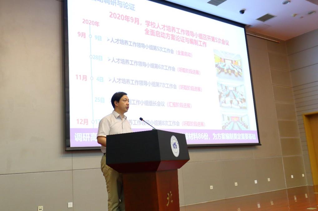 教务处副处长金天对《北航新时代人才培养领航行动计划白皮书》进行解读,从形势分析、方案解读、白皮书解读三个方面系统介绍了人才培养工作的指导思想与具体举措。他指出,新时代,北航将以“着力培养传承空天报国精神、堪当民族复兴大任的领军领导人才”作为新时代人才培养的使命和目标,着力构建高质量人才培养体系。